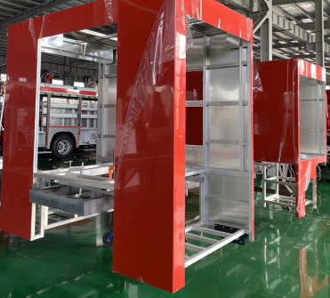 3.1 | 結構設計:鋁合金上裝結構;具有自重輕、耐腐蝕性好、外觀平整美觀,內部空間調整方便、空間利用率高、易改裝、維護便捷等特點;主線路布置在骨架型材板內,可安全保護, 防止損壞;內飾底板為3mm厚的氧化鋁板,通過具有彈性、高粘接強度的進口連接密封膠與主骨架連接;前部器材箱、中部罐體、泵室位于車輛尾部。 |