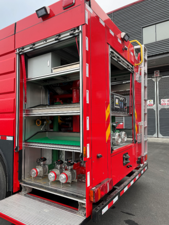 消防系統(tǒng)主參數(shù):水罐容積4000kg、A類(lèi)泡沫500kg、B類(lèi)泡500kg(或其他規(guī)格),消防泵在10bar壓力額定流量為3600L/min,消防炮流量2880L/min。